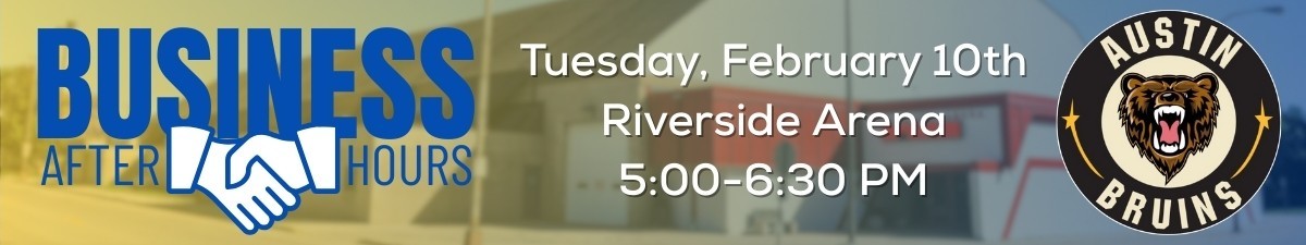 Join the Austin Area Chamber of Commerce for Business After Hours hosted by the Austin Bruins at Riverside Arena in Austin, MN. This casual, after-work networking event is a great opportunity to connect with fellow Chamber members, grow your professional network, and enjoy one of Austin’s most iconic venues.